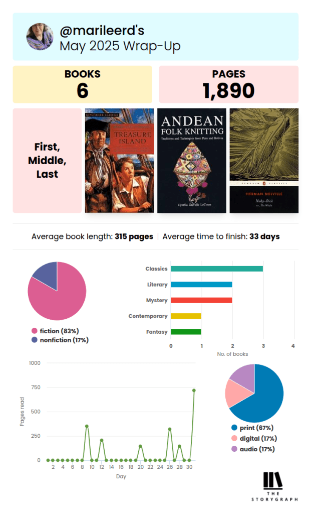 May was a much better reading month than April! I finished a few books that I’ve been reading bits of here and there for a while. (Graphics courtesy of Story Graph!)