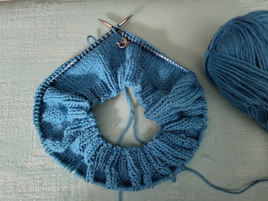 The yarn is one that is new to me, Cascade Anchor Bay, which is a 50/50 blend of wool and cotton. I am using Dark Teal (10) for the background, and Aqua Glass (41) for the colorwork. Alissa of AlissaMakes and I are doing a KAL of it, along with several other KALs we are doing this year. We are KAL gals!