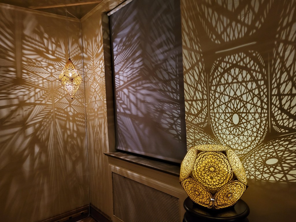Oh, that is super cool! I love the patterns made by the designs on the lamps. (And now I want one for my house.)