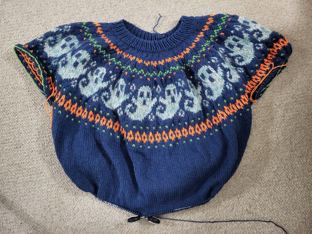 Mostly Ghostly is coming right along! I’m well along on the torso and in an inch or 2 will be able to start the colorwork band at the waist. Then it’s just sleeves and done!