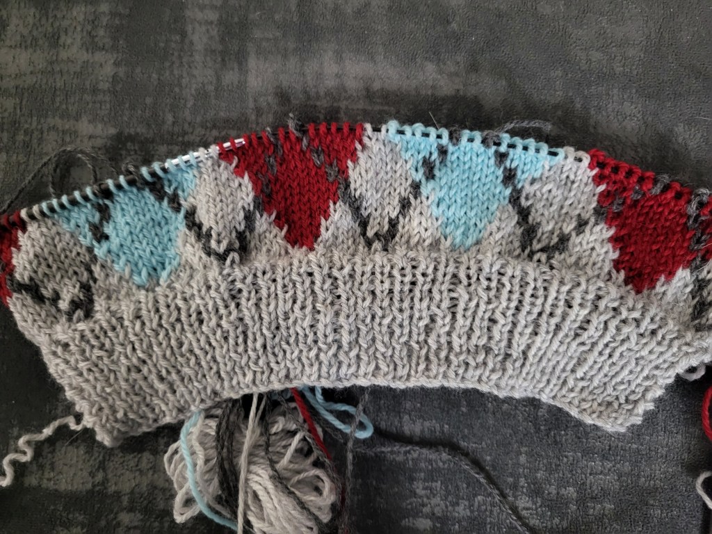 Other than the moon squares, I have one work in progress right now, which is an argyle cardigan. The back, which is plain gray, is done, so now I am starting on the fronts. It’s much slower going because I have a bunch of little bobbins of yarn I have to try to keep untangled, but it is fun.